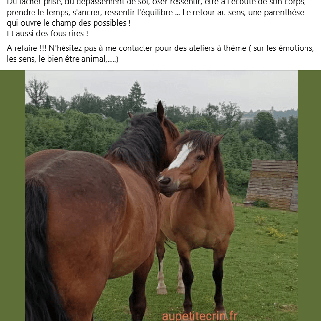 Je peux vous proposer des ateliers autour du cheval : atelier bien-être du cheval / atelier sensoriel / atelier autour des émotions / atelier des 4 saisons / petit spectacle / parcours moteur / prévention des chutes (pour les personnes âgées)…